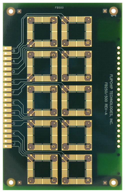Laminate 4-layer FR4 board for placement and daisy chain continuity testing after assembly. Top side of substrate has 10 mounting sites for 48 bumps 6.3mm x 6.3mm. Bottom side of substrate has 10 mounting sites for 96 bumps 12.7mm x 12.7mm Go to--> 909000 kit