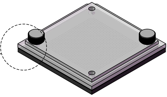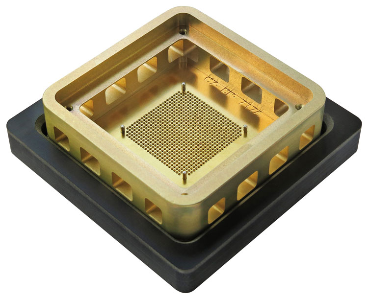 Graphite structure with array of holes to match CCGA pads. Holds columns upright. Bottom side has downset to clear solder paste fillets. Top side has receptacle to accept optional Flip-Pack® U.S. Patents D808350. |