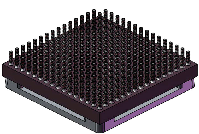 Graphite structure with array of holes to match CCGA pads. Holds columns upright. Bottom side has downset to clear solder paste fillets. Top side has receptacle to accept optional Flip-Pack® U.S. Patents D808350 S. |